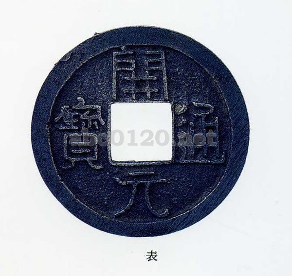 開元通宝の名称については、上下左右の順に対読して「開元通宝」とする説と、時計回りに回読して「開通元宝」とする説が対立しているが、日本をはじめ、影響を初期に受けた貨幣が回読になっていること、8世紀半ばに日本で出た大平元宝(銀銭)、万年通宝(銅銭)が、それぞれ開元通宝の回読と対読によりながら、回読による大平元宝を上位の貨幣としていることから、本来は開通元宝で、のちに開元の年号が使われるようになってから、開元通宝の読みが一般化したと推定できる。これをみても、日本の古代銭が受けた影響の大きさず知られるであろう。出所:『遣唐使と唐の美術』