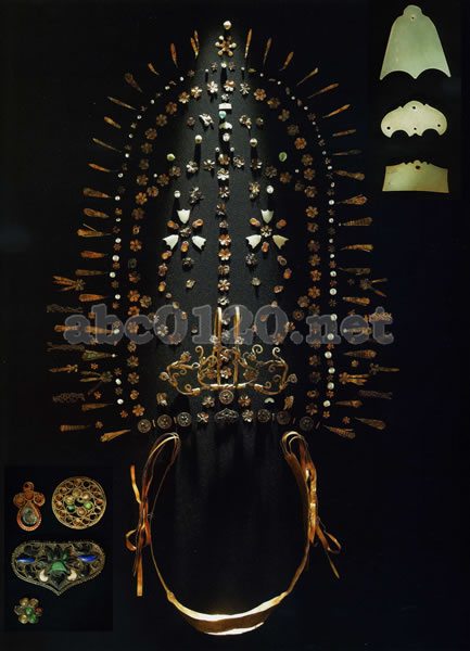 金製の櫛、簪、耳飾などとともに、墓中に安置された遺体の頭部付近で発見された。金、銀、白玉、ガラスなど、多彩な素材を用いて、花形、円形、ハート形、房形といった小片を300点余りも作り出している。各片には小さな孔が空けられていることから、そこに糸などを通して各片をつなぎ、冠などに留めていた頭飾と見られる。図下に見える金製の鐶状部は、その下端を遺体の顎に当て、帯条の部位を顔の左右に回して留めた、いわば顎当といった類のものと推測される。また、その上部に見える金製の蔓草状の部位は、用途はなお明確でないものの、図版の上下を逆にして見れば、遺体の目から鼻にかけて載せた面具の一種と考えることもできよう。唐時代には、いろいろな素材を複雑に加工した各種の装身具が盛んに制作され、貴婦人ばかりでなく、男子の威儀を保つためにもさまざまな場面で使用されたが、これほど多数の部位からなる遺例はきわめて珍しい。出所:『遣唐使と唐の美術』