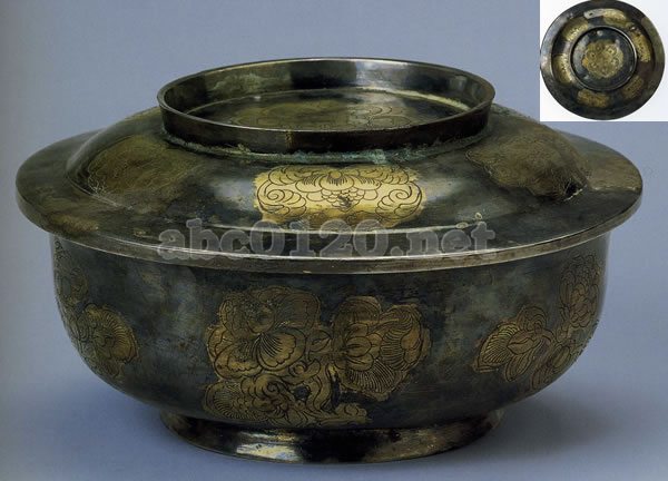 安定感のある器の上に大きめの蓋がかぶさった容器。各部は鍛造になり、蓋上部の把手と器下端の圏足をそれぞれ溶接し、蓋と器の表面に、合計13個の花文を線刻し、そこに鍍金を施して仕上げている。このような形式の碗は、金銀器ばかりでなく、青銅器などでもしばしば制作され、日常の多目的な容器として盛んに使用されたと見られる。日本でも、法隆寺献納宝物をはじめ、類例が多々知られている。唐時代の円形ないし球形の器では、曲面に独特の張りと緊張感がみなぎっているが、この種の器のように、魚々子などの細密な文様表現がないタイプのものでは、そうした唐時代特有の造形をことによくみて取ることができる。