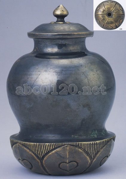 蓮華形の座が付いた球形の胴の上に、宝珠形の鈕を備える蓋がかぶさる。胴と蓮華座は、別々に鍛造された後、銀鑞により溶接さている。蓮華座の底裏の中央に直径5mmほど小孔があき、本来、この下にさらに別の部位がったようである。胴部以上は、唐時代の壺の定形を示すが、このような蓮華座を備える例は類を見ず、きわめて珍しい形式の遺例といえよう。発見時には、内部に褐色の物質が残存していたといわれ、あるいは、丹薬の類を貯蔵するための器であったのかもしれない。細密な文様こそもたないものの、微妙に曲率の異なる曲面をほどよく組み合わせ、引き締まった美しい器形に仕立て上げた手腕には非凡なものがある。出所:『遣唐使と唐の美術』