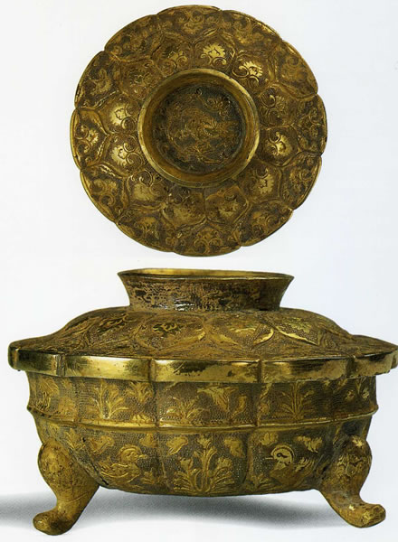 鋳造は、金属の塊(インゴット)を加熱して液体状に溶融し、それをあらかじめ作っておいた鋳型に流し込み、冷却して成形する技法である。鋳造には、鋳型や原型の種類の違いによって、砂型、石型、?型などがあり、唐時代には主に、原型を蠟で形作る蠟型が用いられた。鋳造は、青銅器の成形に最も普遍的に用いられた技法で、金銀器の場合は、鋳造になるものはさほど多くはない。