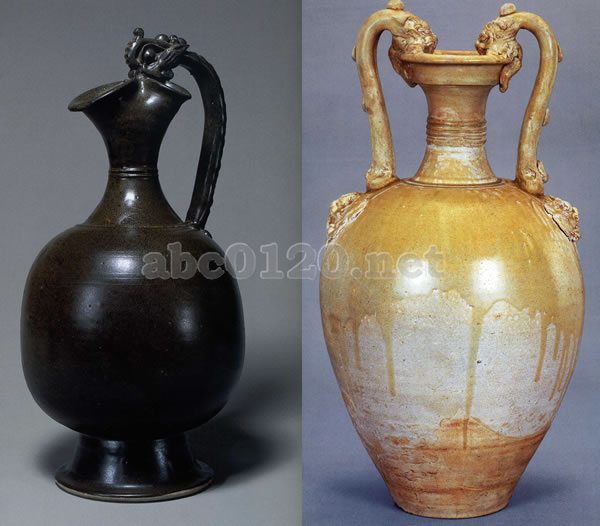 一方、黒釉は鉄分を多量に含む鉄釉の一種で、黒く発色したものをいう。東晋時代の4世紀頃、現在の浙江省を中心とする地域で生産が本格化した。華北地方では、北朝時代の墓からの出土例が確認されている。隋、唐時代には現在の河南省地方で生産されている。出所:『遣唐使と唐の美術』