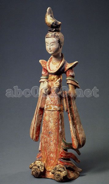 唐時代の加彩俑のなかでも、最も華やかな作品として知られる。肩が眺ね上がり、両袖が異様に大きく、裾に鰭のような形の布を揺らめかす特異な服装から、仙女に扮した舞女の姿と考えられる。顔立ちは涼やかで凛々しく、気品がある。高く結い上げた髷、首飾り、帯など各所に金箔が押されており、衣服に描かれた花文様をはじめ、彩色の保存状態の良さは特筆される。唐の玄宗皇帝が、月の仙女が舞う姿を夢の中で見て、それを再現させた「霓裳羽衣」という舞曲を舞う姿とみる説がある。出所:『遣唐使と唐の美術』