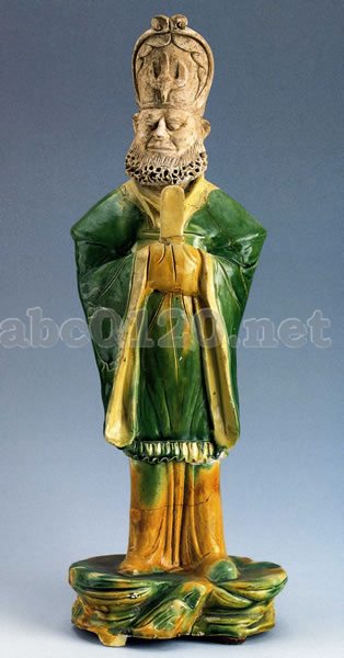 西安市南郊M31唐墓から出土した。文官は単梁冠を被り、首をやや左に向け、身体をわずかに前傾させ、両手で胸の前に笏を持つ姿勢をとっている。藍色の縁取りがある白色の上衣を身に着けており、総飾りが付けられた裾は膝まで達している。胸部に巻かれた帯は、背面で垂らされ、地面にまで届いている。一方、武官は頭に鶡冠を被っており、鼻が高く彫りが深く、豊かな頬髯をたくわえていることから、胡人であることが知られる。緑色の上衣をまとい、身体をわずかに前傾させ、やはり両手で笏を持っている。当時都の長安において胡人が官に登用されていたことを反映しているのであろう。出所:『遣唐使と唐の美術』