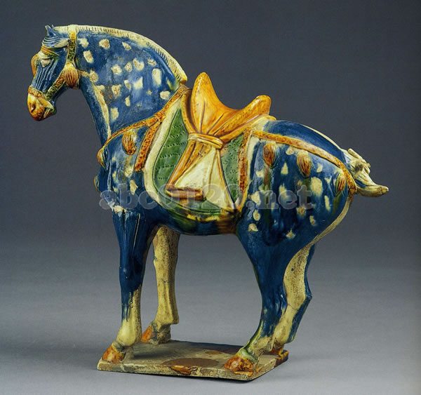 頭をもたげて直立し、前方を見据えている。たてがみは短く刈りそろえられ、尾は束ねられ、豪華な馬具で飾られている。馬身には藍釉が施され、白斑があり、口部と蹄は黄釉が塗られ、たてがみは白色である。韉は緑色で白い縁取りがあり、鞍には黄色の被いがかけられている。頭部と体部には杏葉が飾られた革帯がめぐらされており、黄釉が施されている。唐三彩の馬は数多く制作されているが、藍釉が用いられている例は珍しい。1965年に河南省洛陽市関林で出上土した。出所:『遣唐使と唐の美術』