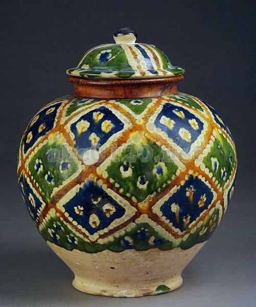 肩がゆったりと丸く張り、宝珠形の鈕が付いた蓋を伴うこの器形は、俗に万年壺と呼ばれる。死後の永遠の食料を蓄える壺と考えられたことに由来する呼び名である。胴部を菱形の区画に区切り、緑釉と藍釉を交互に塗りわけ、それぞれにいわゆる蠟抜きの技法で4つずつ花文が表わされている。各区画の境界には褐釉が塗られ、蠟塗ぬきの技法で縁取られている。数ある唐三彩万年壺のなかでも、際立って複雑な施釉法がとられている。胎土は白色で、胴裾以上に白化粧が施されており、底部は平らである。1965年に河南省洛陽市関林から出土した。出所:『遣唐使と唐の美術』