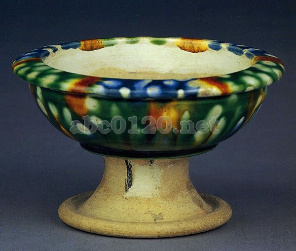 豆とは台脚の付いた高杯のこと。腰が丸く張った碗の口縁を水平に折って鐔縁形とし、ラッパ状に広がった台脚が付く。内面口縁部から外面にかけて白化粧が施されており、褐釉、緑釉、監釉で彩られ、いわゆる蠟抜きの技法で一面に白斑が表わされている。内面と台脚には施釉がなく、露胎となつている。小品ながら、彩釉の鮮やかな発色が印象的である。1953年に河南省洛陽市龍門香山寺から出土した。出所:『遣唐使と唐の美術』