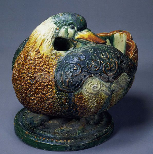首を後ろに振り向け、羽を休める鴨の姿をかたどっている。胴は中空であり、尾の部分は8曲の長杯の形に作られていることから、おそらく銀器を写した器形なのであろう。円点文で2重に囲まれた円形の台座の上に載っており、翼には唐草文が表わされている。型を用いて成形されているが、鴨の表情は生き生きとしており、とくに胸から胴にかけての力強い張りが印象的である。深い発色の緑釉、褐釉もていねいに塗り分けられており、特別な目的のために入念に作られた三彩器であることがうかがわれる。出所:『遣唐使と唐の美術』