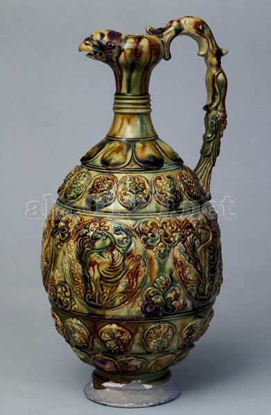 隋・唐・五代|陶磁器>三彩貼花文鳳首瓶