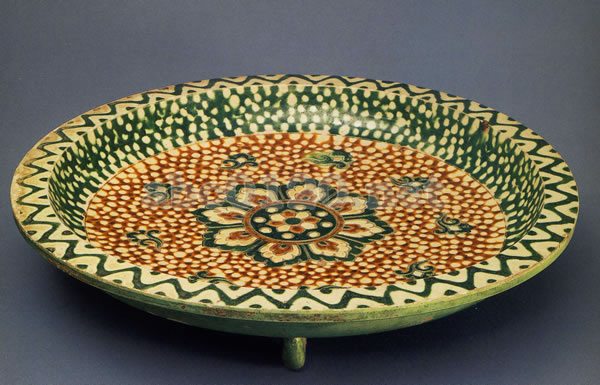 口縁は鋭く折られて鐔状になっており、金属器の形を模していることがうかがわれる。底裏にはループ状の足が3つ付けられている。型押しの技法で中央に宝相華文、周囲に流雲のような形の花文が9つ表わされ、それぞれの文様の輪郭の中を各種の彩釉でていねいに塗り分けている。内底には褐釉の地にいわゆる蠟抜きの技法による白斑文が密に表わされ、その外周には緑釉地に同様の白斑文が配されている。これらもまた銀器の魚々子文を写そうとしたものであろう。口縁には緑釉による波線と点彩が表わされ、裏面外周と足部には緑釉が施されている。数ある唐三彩盤のなかでも、群を抜いて華麗な作品である。出所:『遣唐使と唐の美術』