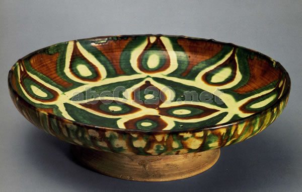 白、緑、褐色の3色を同心円状に用いて、内区に4つ、外周に8つの花弁文が表わされている。大柄で印象的な文様表現は、数ある唐三彩のなかでも出色のものである。口縁部に釉薬が溜まっていることからわかるように、見込みにある3カ所の小さな目で受け、天地逆に伏せて焼かれている。釉薬が流下することにより、彩釉が入り混じり、文様が不鮮明になることを避けるための工夫であろう。外側はいわゆる蠟抜きの技法を用いて緑釉と褐釉とが斑状に流しかけられている。底部に外開きの脚が付けられている。出所:『遣唐使と唐の美術』