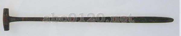 木製漆塗り 通長52cm (編磬の附属品) 磬を叩く木槌である。槌の部分はぼぼ八角柱で、柄は精円形である。全体は黒漆を地とし、朱色と黄色で綯紋、雷紋、三角雷紋を表わす。曽侯乙墓では同様の磬槌がほかにもう1点出土している。出所:『曾侯乙墓』 特別展 日中国交正常化20周年記念
