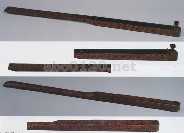 身の全体に黒漆を塗って地とし、底部・側面・および上面の首側の部分に、朱色と黄色で繁縟な紋様を描いている。さまざまな紋様がみられるが、もっとも広い面積を占めるのが、細かい格子紋を地とした鳥紋であり、琴の首側の上面、尾側の側面などに施されている。また首の側の底面には、人間のような像と絡みあった蛇の図が二つずつ描かれている。この五弦琴の形状は、他に類例のない特異なものである。演奏に供する楽器ではなく、楽器を作る際に音の高さの基準を提供する器具であるとの説もある。出所:『曾侯乙墓』