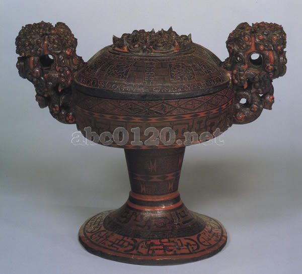 まるで、青銅器を思い起こさせるようなこの蓋つきの漆豆は東室から出土したもので、これと同様のものは、このほかに東室から3件が伴出している。そのなかでも、これはすばらしい保存状態をみせたものとして知られている作品である。