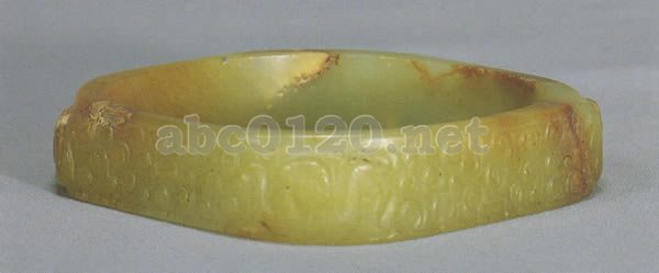 長7.4cm、幅7cm、高1.5cm 隅丸方形の輪で、孔は片方から穿たれている。外表面の四隅にはそれぞれ曲りくねった龍を浮彫にしており、各面には穀紋を彫刻している。出所:『曾侯乙墓』 特別展 日中国交正常化20周年記念