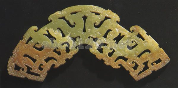 璜とは壁を半分にした形と言われるが、実際には3分の1位のものが多い。新石器時代に出現する。この璜は曽侯乙の棺の中から発見された一対のうちの一つで、頭を後ろに巡らせて振り返るS字形の動物を2匹ずつ対称形に配し、下に鳥1羽と蛇を1匹表している。これと一対をなす玉璜もほぼ同じ図柄であるが、蛇が6匹表されている。出所:『曾侯乙墓』