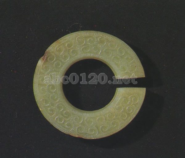 径5cm 玉の飾り このような玉器も新石器時代から知られている。両面とも雲紋で飾られている。出所:『曾侯乙墓』 特別展 日中国交正常化20周年記念