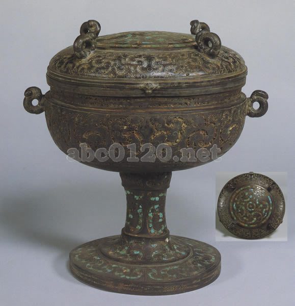 豆とは、食物を盛る高い足のある器である。蓋には四つの蛇形の鈕が付き、器体からずれないように三つの獣面形の突起が端に付けられる。器体にも蓋と同様の鈕が二つ付く。器全体が象嵌で装飾されている。トルコ石がよく残り美しい。蓋の中央には鳥首龍紋が四つ巡り、その外側にも上下互いに組合わさった2匹―組の鳥首龍紋が8組表わされる。器体にも同様に2匹一組の鳥首龍紋が8組巡っている。足と盤の部分には勾連雲紋が表される。蓋と器の内壁には「曽侯乙作持用終」の銘文がある。出所:『曾侯乙墓』
