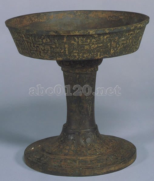 浅い盤に中空の脚が付く。蓋は無い。盤と脚の側面に象嵌で紋様を施す。象嵌の多くはトルコ石であったようだが、すでにかなり剥落している。盤の内底に銘文があるが、その状態はやや複雑である。「曽侯乙作持用終」と7字の陰文銘文があるが、よく見ると「終」の字の下に逆向きに陽文の「曽」の字と下書の縦横の線があり、しかも「曽」の文字は不完全である。鋳型を作るさい、当初陽文の銘文を作ろうとし、范に曽の文字を刻みかけたところでやめてしまい、改めて、「曽侯乙作持用終」という陰文の銘になるようにしたものと思われる。身と脚は別々に鋳造し、接合したものである。出所:『曾侯乙墓』