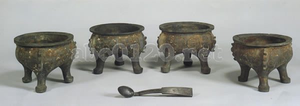 匕は、2点の鬲の口縁上に置かれた形で2点出土した。いずれも渦紋で節られるが、裏に「曽侯乙作持用終」の銘文がある。鬲とは食物を煮るための器であるが、この鬲の大きさは1人用とも考えられる。また付属したとの大きさも、食器として適当である。出所:『曾侯乙墓』