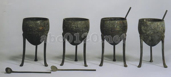 卵の先端を切ったような形の容器で、細長い脚が三本付く。身の側面にはトルコ石の象嵌を施すものと、施さないものがある。 匕には紋様がない。 曽侯乙墓ではほぼ同形の鼎形器が10点出土し、それぞれとを伴っていた。これも食物を供える器である。出所:『曾侯乙墓』