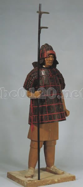 頭にかぶる冑と、身、裾および袖につける甲の四つの部分からなっており、いずれもさまざまな形に切られた皮片に穴をあけ、馬甲と同様に絹糸でつづってつくっている。そして、皮の截片にはおおむね、黒漆、もしくは黒褐色の漆が2、ないしは3回ほど塗られているが、なかには朱漆を塗ってから、さらに黒漆をほどこしたものもみられる。