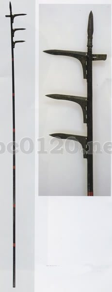 先に刺(矛)が付き、三つの文が付けられる。刺の袋穂の部分は獣面で飾られる。柄の断面は、前が細く後ろが太い卵形であり、中が木製で外側に割り竹を貼り、外から糸を巻いている。本来の柄には赤と黒の色が塗られていた。出所:『曾侯乙墓』