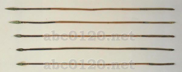 青銅・竹 長59.4~71.0cm、矢柄の径4~7mm 矢柄は竹で、両端の8~15cmの部分は絹糸を巻いたのち黒漆を塗っている。末端には弦に掛けるための欠き取りがある。出所:『曾侯乙墓』 特別展 日中国交正常化20周年記念