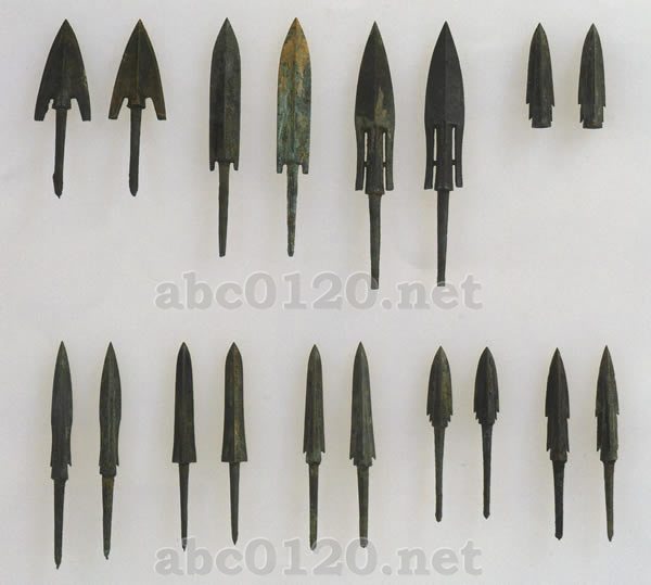 青銅製 長5.1~13.3cm 三角形、双翼形、方錐形、円錐形などの型式がある。曽侯乙墓からは4507本に及ぶ鏃が出土している。出所:『曾侯乙墓』 特別展 日中国交正常化20周年記念