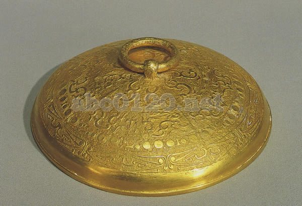 蓋だけ単独で発見された。鋳造によって作られものと思われる。ドーム形で、項上に鈕があって環が一つ付く。紋様は、先の金製盞の紋様とは趣を異にし、青銅器の象嵌紋様や、瑟・五弦琴などの漆絵のモチーフと通ずるものが多い。分析によれば、純度は88%で、12%の銀を含む。出所:『曾侯乙墓』
