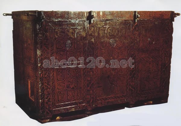 長方形の箱形で、銅の枠に木板をはめ込んだものである。外面全体に黒漆を塗って地とし、彩漆で紋様を描いている。北側(足側)の面の右下には高34cm、幅25cmの孔が開けられている。これは霊魂が出入りするためのものといわれている。発見時の重量は約7トンであった。出所:『曾侯乙墓』