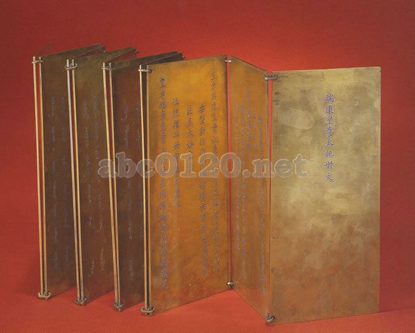 端康皇貴太妃は、姓は他他拉氏、光緒帝の妃である。光緒20年(1894)、妹の珍妃とともに瑾妃の称を授かる。1913年、「端康皇貴妃」の尊称を授かり、1922年12月、溥儀(清朝最後の皇帝)の婚礼の時、さらに「端康皇貴太妃」の尊号を得る。その際にこの宝冊に記録され、その身分を証明した。1924年、溥儀が宮延を出る日の前夜にこの世を去った。冊には満州文字と漢字が使用され10枚からなっている。出所:北京・故宮博物館名宝展-紫禁城と中国4000年の美の秘宝