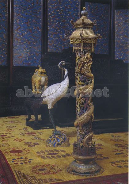 仙鶴(丹頂)は伝説中の神鳥であり、若さと長寿を表わす。七宝仙鶴は岩の上に立っており、頭頂部は赤く、頸部は黒く、その他の部分は乳白色をしている。細い金属線で図柄の輪郭をつくり、その間を釉薬で埋めており、羽毛状になっている。仙鶴が皇帝の宝座の傍らに置かれているのは、皇帝の国家が万代にわたり、永遠に存続するように願う意味がこめられている。出所:北京・故宮博物館名宝展-紫禁城と中国4000年の美の秘宝