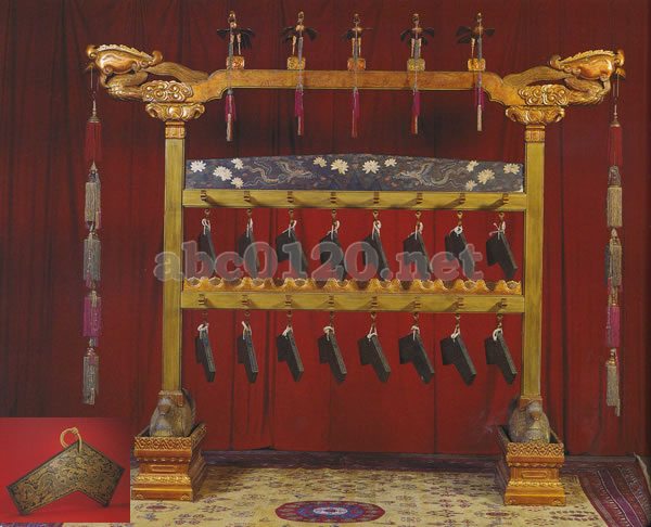 碧玉編磬は中和韶楽(国家の大きな式典の際に演奏された最も格式の高い音楽)に用いられた楽器の一つである。編磬の両面には金彩で雲龍の文様が描かれ、長短の足に分かれている。側面にはそれぞれ音の高さを表わす音律の名が記され、その律名は編鐘と同じである。厚さはそれぞれ異なるが、大きさは等しい。磬の上部には小さな穴があり、これに紐を通し、木架(簨虡)に上下各八つずつ掛ける。上段は陽律であり、右から、「倍夷則」「倍無射」「黄鐘」「太簇」「姑洗」「(蒙+牛)賓」「夷則」「無射」という。下段は陰律であり、右から「倍南呂」「倍応鐘」「大呂」「夾鐘」「仲呂」「林鐘J「南呂」「応鐘」という。木架の形態、寸法は編鐘の木架と同じで、上部左右には鳳凰の頭部が彫られている。その間には金色の五羽の鳳凰が並んで翼を広げ、その嘴からは五色の紐が垂れている。下部には嘴が赤く羽根の白い鴨が飾られている。編磬は、たいてい朝廷の公の祝賀、巡幸、凱旋の際に必ず用いられ、楽部和声署がこれを執り行った。また、朝廷内での慶賀、皇太后御殿での祝賀、あるいは外藩。公主(皇帝の息女)・王妃をもてなす宴の際は、皆全て内務府によって編磬が取り扱われ、これが殿内西側に設置された。出所:北京・故宮博物館名宝展-紫禁城と中国4000年の美の秘宝