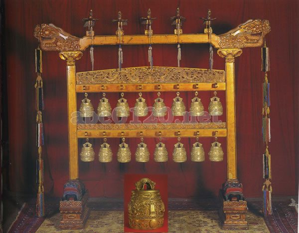 編鐘は16口を一セットとして、陰律と陽律それぞれ8口ずつに分かれる。外形は全て同一であるが、鐘壁の厚さによって音の高低が異なっており、12の本律と4つの倍律に対応している。鐘名は順に「倍夷則」「倍南呂」「倍無射」「倍応鐘」「黄鐘」「大呂」「太簇」「夾鐘」「姑洸」「仲呂」「(蒙+生)賓」「林鐘」「夷則」「南呂」「無射」「応鐘」という。「倍夷則」は鐘壁が薄く音は最も低い。それから順に音がだんだん高くなり、応鐘が最も高音となっている。鐘は楕円形をしており、頂部と口部は平らで、二頭の龍の形の鈕(吊り手)がついている。本体は雲龍の文様で飾られており、表の面には「康熙五十二年審定」と刻まれ、背面にはそれぞれの律名が鋳出されている。通常、慶賀や朝会、大典等に用いられ、編磬とともに、それぞれ東と西に分かれて並べられた。演奏時は、まず柷(古代の打楽器)を合図として鳴らし、さらに鎛鐘(古代の大形の鐘)がひと鳴りしたあと、編鐘がこれに続く。中和韶楽の演奏の上で重要な楽器である。出所:北京・故宮博物館名宝展-紫禁城と中国4000年の美の秘宝
