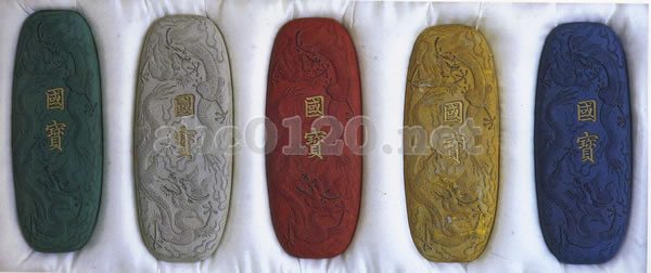 国宝墨は赤、白、黄、青、緑の五色からなる。「牛の舌」の形に作られ、それぞれ同じ文様が彫られている。片面の中央には楷書体で「国宝」の金の二字が陰刻され、周りには力強くたくましい二頭の龍が浮き彫りされている。龍は互いに上下から顔を向き合わせている。もう一方の面には、同じく楷書体で「大清乾隆年造」の銘が陰刻され、そこに金彩が施されている。銘の上下左右には雲文が表わされている。国宝五色墨は明代の墨の作風に倣って作られたものである。このような古墨をまねた製作は乾隆帝が尚古趣味を重んじたことに出来している。出所:北京・故宮博物館名宝展-紫禁城と中国4000年の美の秘宝