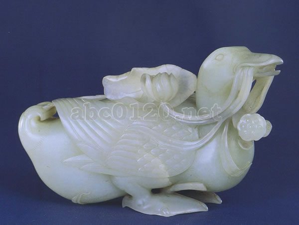玉は青色。うずくまる鴨の姿が彫り表わされている。鴨は口に蓮の花と水草の茎をくわえている。胸のあたりには蓮の実もみえる。鴨の体の中は空洞でここに水をため、蓋と杓はない。鴨の尾羽根は丸く巻いている。水滴は水注、水盂、水丞とも呼ばれ、墨を研ぐ際に水をためておく器である。玉製の水滴は清代の文房具の中でも一般に精巧であり、この作品に近い類例はよく見ることができる。出所:北京・故宮博物館名宝展-紫禁城と中国4000年の美の秘宝