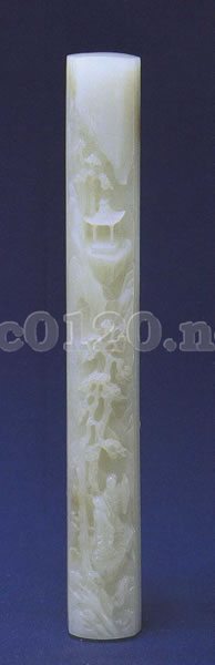 玉質は純白。底は平たく滑らかで、表には文様が深く彫られている。上方には絶壁、岩、東屋、中心部には空高くそびえる樹木、下方には松、その下に泉、崖、そして泉を見ながら、この景観を談ずる二人の人物が見える。これらの文様はバランスよく配置され、精緻に仕上げられている。いずれも立体感に富み、山水画を凝縮したような作品である。鎮子はまた鎮尺とも呼ばれ、紙をおさえるときに用いる道具である。その形には細長いものや鳥獣をかたどったものがある。これは清代中期の精巧な文房具の一つである。出所:北京・故宮博物館名宝展-紫禁城と中国4000年の美の秘宝