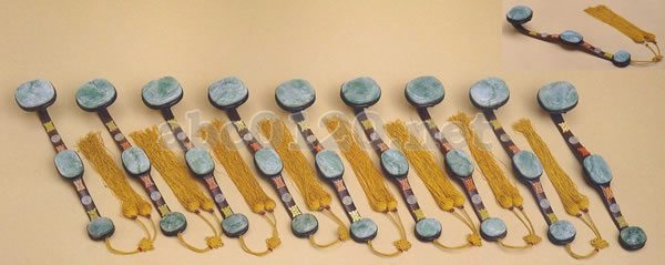 如意は本来、孫の手のように背中をかいたりする日用品であるが、仏教では僧侶が説法などの際に威儀を正すための用具として用いられた。名称は意の如くするという意味である。この如意は紫檀木製で、頭部を幅広く、柄の中央を突き出させ、柄の下方を円形に作っている。頭部、柄の中央部、柄の下部に、大、中、小の楕円形の翡翠が嵌めこまれている。翡翠は透明感があって光沢があり、それぞれ桃と蝙蝠、仏手柑、石榴の3種の文様が刻まれている。白玉、黄玉(トパーズ)、珊瑚で作った「寿」字が柄の2個所に嵌めこまれている。柄の下方には盤長(仏の教えが遍く行き渡ってあらゆるものが明らかなことを意味し、盤長文は、仏教に関わる八つの吉祥文の一つ)の形に組んだ黄色い房鈕が結びつけられている。外観は質朴であるが、彫刻は非常に精緻であり、玉類も良質なものが使われている。赤、黄、白、緑が交互に配色され、優雅で気品のある作品となっている。清代中期の作で、「多子多孫」「福寿万代」の吉祥の意味をもつ如意である。出所:北京・故宮博物館名宝展-紫禁城と中国4000年の美の秘宝