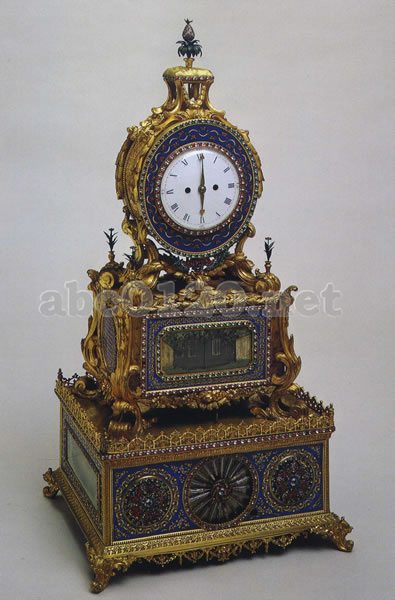 時計は全体に銅地に鍍金を施し、藍色に焼きつけた薄板を嵌装し、色ガラスを嵌装している。構造は3層に分かれる。下層はオルゴールで、正面中央に回転式の噴水を配し、その両側には色とりどりの色ガラスで作られた回転式の花文様が配され、さらに、その周囲は色鮮やかな藍色の七宝板が嵌め込まれている。左右両面には油彩による風景画と走る人形があしらわれている。中層の正面には左右に開く自動扉があり、その中に自動で動く小さな人形が見える。窓の周囲は内側から順に緑と白の色ガラス玉、藍色の七宝板、赤と白の色ガラス玉の枠で飾られている。その他の3面は、銅に金鍍金を施した地に藍色を焼きつけた板が嵌め込まれている。上層は最上部に回転するパイナップルをつけ、その下が時計で、文字盤上の二つの穴はぜんまいを巻く穴である。時計の周囲は藍色の板と赤と白、緑と白のガラス細工帯で飾られ、背面には鏡が備えてある。スイッチを入れると快よい音楽に合わせて、人物と噴水と花が動きだし、我々の目を楽しませてくれる。出所:北京・故宮博物館名宝展-紫禁城と中国4000年の美の秘宝