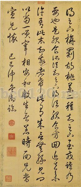 愛新党羅・弘暦即ち乾隆帝は自ら書画等をよくし、山水、草花、蘭竹、梅花、折枝などを描くことを得意とした。『(雨+妻)嶽楼筆談』によれば、「情を翰墨(筆や墨)に栖ませ、意を済覧(見物してまわる)に縦(ほしいまま)にし(思いどおりにし)、一所に至る毎に必ず詩を作り勝を紀し(景勝の様を書き記し)、刻石に御書す」とあり、多くの書が残っている。書はもっぱら趙孟頫(中国元時代随一といわれる書画家)を学び、書体は暢びやかかつ潤いがあって秀麗である。ただ、やや柔弱に過ぎ、変化に乏しい面もある。これは王羲之の書を臨模(原典を見ながら写すこと)したものではあるが乾隆帝の書風から離れるものではなく、乾隆帝の書に一貫して見られる書風を示している。「己己仲冬」の落款から、乾隆帝38歳の作とわかる。落款の下には「三」(即ち「乾」)(朱文円印)、「隆」(朱文方印)、「御書」(朱文方印)の印章がある。出所:北京・故宮博物館名宝展-紫禁城と中国4000年の美の秘宝