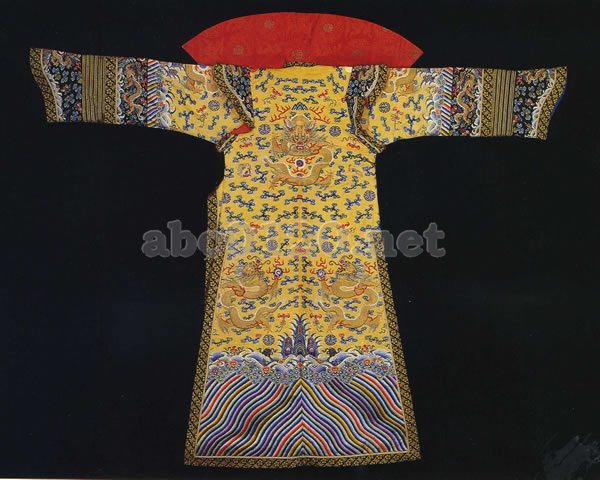 明黄色の薄い絹地に雲龍文を刺締した袷仕立ての朝袍である(朝袍は礼服として着用される長い着物)。明黄色朝袍は、清代皇后の礼服の一つで、皇后は毎年の元旦、冬至、万寿節(皇帝の誕生日)および親蚕(皇后が自ら行った蚕を養う儀式)など重要な儀式の際に、こうした礼服を着用して参列しなければならなかった。皇后の礼服は朝褂、朝袍、朝裙(裙は腰から下を覆うスカート状のもの)からなり、着用時は必ず三つあわせて着用しなければならなかった。皇后朝袍は左右が裾までまっすぐな直身式の袍に属し、その形は丸首で襟がなく、肩飾りがつき、両肩に縁どり布があり、右袖つけの部分が上前あわせになっていて、袖は馬蹄形、裾は左右開きになり、彩雲、金龍、波涛文、岩山の模様が刺繍されている。この明黄色の薄い絹地に刺締をほどこした皇后の朝袍は、刺繍にしてもあるいは染色にしても最上のものというわけではないが、その模様にはひときわ目立った特色がある。よく知られているように十二章模様(古代、皇帝の服につけた12の飾り模様)(太陽、月、星、山、龍、黼く斧の模様〉、黻く二つの弓を背中合わせにした模様〉、華虫く雉子〉、宗彝〈儀式用の祭器の一つ〉、水藻、火、粉米く白米のこと〉)は、皇帝の権力の象徴であり、清朝の皇帝の朝抱と龍抱だけに用いられた模様であったが、この皇后の朝袍にこれらの模様が見られるのは、そこに皇帝の権力を我がものにしようという野望がひそんでいたからではないだろうか。では誰がこのような天下の大悪をあえて冒したか。それは中国の歴史上あまりにも有名なエホナラ氏出身の慈禧皇太后(西太后)(1835~1908)である。慈禧は「垂簾聴政」」(太后、皇太后が幼い皇帝にかわって政治を行うこと)を行うようになってからは自らを清朝の則天武后(唐第三代皇帝の皇后で皇帝にかわって自ら帝位につき専制政治を行った人物)と大言した。彼女は女帝さながらにふるまい、当然のように十二章模様を用いはじめたため、清朝末期の皇后朝袍もこれにならい始めた。この十二章皇后朝袍は、こうした史実を伝えており、その出現は清朝の厳格な冠服制度が完全に崩壊してしまったことを示している。ただ、この朝袍には十二章のうち八章しか用いられておらず、この朝抱の持ち主は十二章を使用するにあたっては少々はばかるところがあったようである。出所:北京・故宮博物館名宝展-紫禁城と中国4000年の美の秘宝