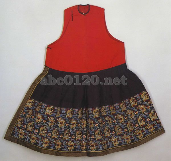 石青色(黒みがかった紫色)の地に緙絲(綴織)で彩雲(いろとりどりの雲)と金色の龍をあしらった綿入れの朝裙である。朝裙(裙はスカート状の服)は清代皇后の礼服の一つで、朝袍(礼服として着用される長い着物)の下につけるもの。形式は丸首で襟がなく、上前を右の袖付けのあたりでとめ、袖はない。上衣と下裳が繋がっており、その間の腰の部分に襞がよせてある。これは清代皇后の宮廷衣装のなかで唯一上下の色が異なる衣装である。この朝裙は雲の文様を織った赤い繻子を裏地とし、木綿の綿入れがしてある。上衣は赤い南京産の絹の綾織物(糸の浮きが斜めに続く織物)、下裳は石青色の地に緙絲(中国の絹の綴・織。平織であるが文様を織るよこ糸は地を織るよこ糸とは別の糸を用いる)で小さな立ち姿の龍文を表わしている。緙絲は「刻絲」とも呼ばれ、古代中国に独特の染織工芸である。緙絲は古くは唐代に起源し、当時は書画の表装や、建物の門の簾や椅子の覆いなどに多く用いられた。明・清の二代にかけてその水準はピークに達し、服飾用としても大量に応用されるようになった。繊りの工程が難しく、文様が複雑になるほど費用もかかることから「一寸緙絲一寸金」といわれ、王侯や高位高官でさえ得難い品物であった。この皇后緙絲朝裙は素朴ではあるが品格があり、つくりは伸びやかである。清代皇后の秋冬用の高貴な服である。出所:北京・故宮博物館名宝展-紫禁城と中国4000年の美の秘宝