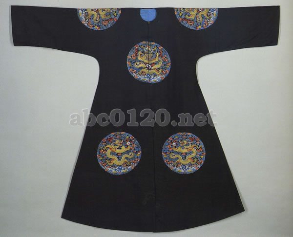 石青色(黒みがかった紫色)の紗(透かし目のある薄手の織物)の地に八つの団龍文を刺繍した波涛文のない綿入れの龍掛である。石青色八団龍掛(地が石青色で八つの丸い龍文のある龍掛)は、清代皇后の礼服の一つで、袖口及び裾の模様の違いによって八団有水龍褂と八団無水龍褂に分けられる。この服は、八団無水龍褂である。皇后は、皇帝の婚儀や、躬桑(皇后や皇妃たちがみずから桑を摘んで養蚕を奨励すること)などの祝い事の際や祝祭日に八団龍掛を着用した。皇后の龍褂は単独で着用されることはなく、必ず礼服の一つである龍袍とともにその上着として着用された。服の形式は丸首で襟がなく、対襟(前襟が向かい合った形)、平袖で、着丈は膝より長く、両肩の前後に正面龍文(龍文のうち最も高貴な形式の一つで、龍首は正面を向き正面向きに座す姿)が各一つ、裾の前後に行龍文(駆ける姿の龍)が各二つずつ刺繍されている。この龍褂は皇后が秋から冬にかけて着用した服で、月白色(薄い藍色)の平織の絹を裏地とし、中に薄い真綿が入り、石青色の目の詰んだ紗(透かし目のある薄手の織物)の上に団雲龍文が8個所色糸で刺繍されている。模様は簡潔で、主題が左右対称に浮かび上がって見える。加えて優美繊細な刺繍模様がこの皇后の龍褂にいっそうの品格をもたらしている。清代嘉慶年間の服飾芸術の水準の高さを示す作品である。この服には襟口に黄色い付箋があり墨書で「石青紗綉八団金龍棉褂一件、道光二十五年十月十四日収、進安交」と記されている。出所:北京・故宮博物館名宝展-紫禁城と中国4000年の美の秘宝