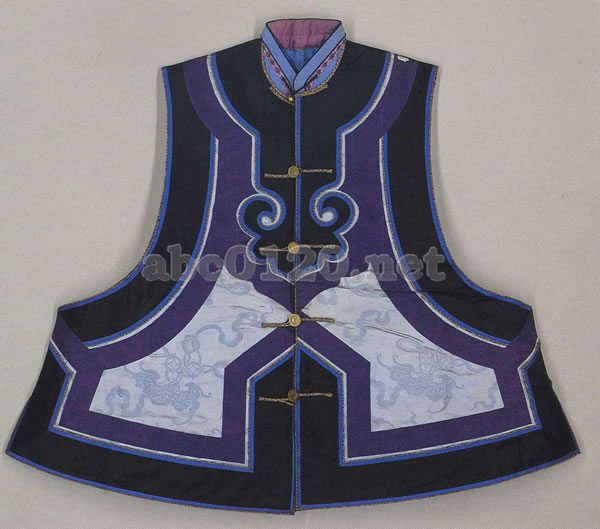 湖色(みず色)の地に暗花(模様を織りで表わすこと)で蝙幅や古銭の模様を織った繻子織をあしらい、綿入れに仕立てた対襟(前ボタン式)の坎肩(袖のない上着)である。坎肩は、「馬甲」「背心」とも呼ばれ、清代の皇后、皇妃が燕居(夫婦の間)で着用した普段着である。皇后、皇妃が便袍あるいは氅衣のどちらを着ていても、その上には好んで坎肩が着用された。坎肩は寒さをしのぐだけでなく、デザイン的に非常にファッショナブルな衣服でもあった。坎肩は袖のない上半身だけの着やすい服であったことから広く親しまれ、清代の高位の役人の家などでも男女を問わず普段着として用いられた。次肩は一番外に着ることから模様の種類は非常に豊富である。ふつうは団花文(丸くまとめた花模様)、折枝文、八宝文(仏教に関わる八つの吉祥文)、漢瓦文(漢代が瓦の文様)、万寿文(卍字と長寿を意味する桃などを組み合わせた文様)などがよく用いられ、雲形の縁で飾られている。この湖色暗花坎肩は詰襟がつき、裾は左右と後方に開く形態である。月白色(薄い監色)の平織の絹を裏地とし、表は蝙蝠と古銭の模様を織り表わした湖色の繻子織をあしらうが、この模様には「福は眼前にあり」の意味がある。服の周りが青で縁取られ、典雅な趣を添えている。これは清代皇后、皇妃の秋冬用の衣服である。出所:北京・故宮博物館名宝展-紫禁城と中国4000年の美の秘宝