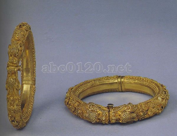 金鍍金を施した銀の細線を編み上げて作った腕輪。腕輪は皇后、皇妃たちが用いた装飾品である。この腕輪は、開閉部は2頭の龍が向かい合う形に作られている。2頭の龍の口に金鍍金された細い棒が通って繋がっており、外すときには龍の口から細い棒を抜けば簡単に開くという構造である。極めて精緻な工芸品である。出所:北京・故宮博物館名宝展-紫禁城と中国4000年の美の秘宝
