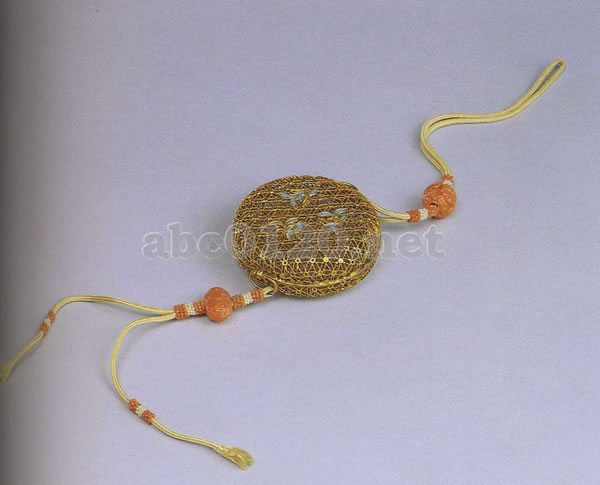 品位60%の金の細い線を編み上げて作った香入れ。身と蓋に分かれる。身、蓋とも細線を編んだもので、全体に五弁花形の繋ぎ文様に編みあげられている。両面に美しい翡翠の羽を貼りつけた花が三つずつあしらわれている。下部に留め金があり、ここから開閉する。この香嚢には香料のほかに生花をいれておくこともでき、細線の編み目の間から香りが漂い出る仕組みとなっている。上下の絹の紐には大小の珊瑚、小粒の真珠が通されている。腰帯に掛けて装飾品として用いられた。出所:北京・故宮博物館名宝展-紫禁城と中国4000年の美の秘宝