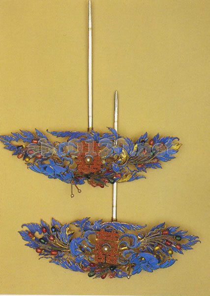 銅地に金鍍金を施し、翡翠の羽を貼り込み、ガラス玉を嵌め込んで栗鼠、葡葡、双喜文をあしらった髪飾り。翡翠の羽が貼り込まれた葡萄の葉を背景とし、髪飾りの中心に小さな珊瑚の玉が縫いつけられた双喜字が飾られ、その中心に真珠が1個嵌め込まれている。両側に翡翠の羽を貼り込んだ小さな栗鼠が戯れている。栗鼠の2本のヒゲは細い線で編み上げられ、先端に小さな真珠が飾られている。髪飾りのまわりには桃色や緑のガラス玉が連なり、きらめく葡萄の実となっている。髪飾りの足は銅地に金鍍金製。色の鮮やかさや華麗さに加えて、栗鼠や葡萄の文様があしらわれており、この髪飾りには祝いの喜びが込つられている。出所:北京・故宮博物館名宝展-紫禁城と中国4000年の美の秘宝