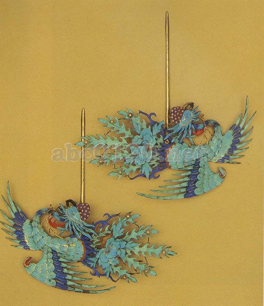 髪飾りは女性が頭に飾る装飾品で、貴族の女性、特に"金や翡翠の首飾りをつけ、真珠で身を飾った″皇后、皇妃たちは、髪全体に翡翠や真珠を飾ることを晴れがましいこととした。この髪飾りは清代中後期に皇后や皇妃たちが愛用したものである。翡翠の羽が貼り込まれた雲を背景に、中心に1匹の蝙幅と寿桃(誕生を祝う桃)があしらわれており、蝙蝠の胴と寿桃は,ルビーで作られている。蝙蝠のヒゲは細線を編み上げたもので先端に真珠が一つずつ飾られている。右側には色ガラスでできた海棠の花が、左側には翡翠の羽で飾られた太湖石、竹、蘭花も見える。髪飾りの足は銅地に金鍍金を施したものである。精緻なつくりを見せる写実性に富んだ髪飾りである。出所:北京・故宮博物館名宝展-紫禁城と中国4000年の美の秘宝