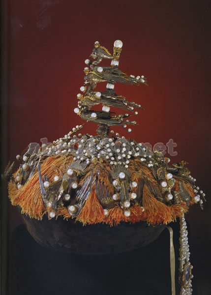 皇帝の冬用の朝冠は、時に応じて煤貂か黒い狐の毛皮で縁取り、上に反り返らせる。冠の頂上から赤い紐を綴じ合わせ、縁の外まで垂らす。東珠(中国東北部に産する珠玉)を1個ずつ四つの金製の龍に交互に通して重ね合わせ、上に大粒の真珠を1個飾る。頂上には左右からの支えがある。また縁の下には首にかける下げ紐がある。